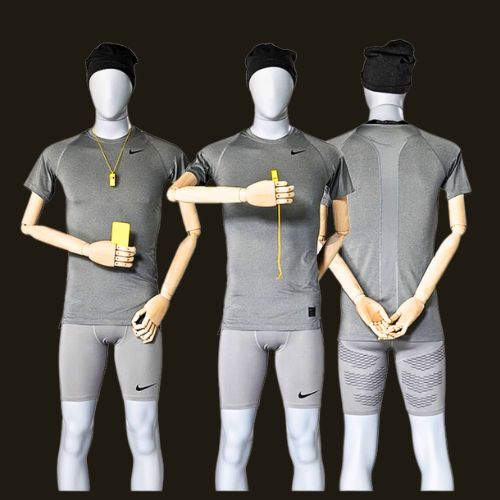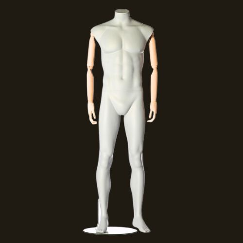 Mit flexiblen Holzarmen in einer aufrechten Stellung. Die Schultern des Mannequins sind so geformt, dass die präsentierte Kleidung optimal fällt. Die Figuren werden mit einem Wadenstachel und einer quadratischen Metallplatte ausgeliefert.