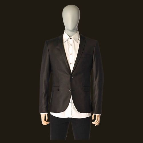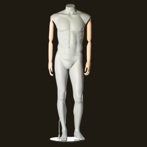 Mit flexiblen Holzarmen in einer aufrechten Stellung. Die Schultern des Mannequins sind so geformt, dass die präsentierte Kleidung optimal fällt. Die Figuren werden mit einem Wadenstachel und einer quadratischen Metallplatte ausgeliefert.