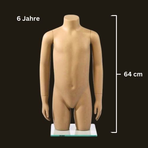 Kopfloser Torso entsprechend einem sechsjährigen Kind. Der Torso schafft Präsentationsflächen für Kindermode auf Regalen sowie Tischen und passt natürlich zu den Vollfiguren der Hindsgaul Fresh-Kids.