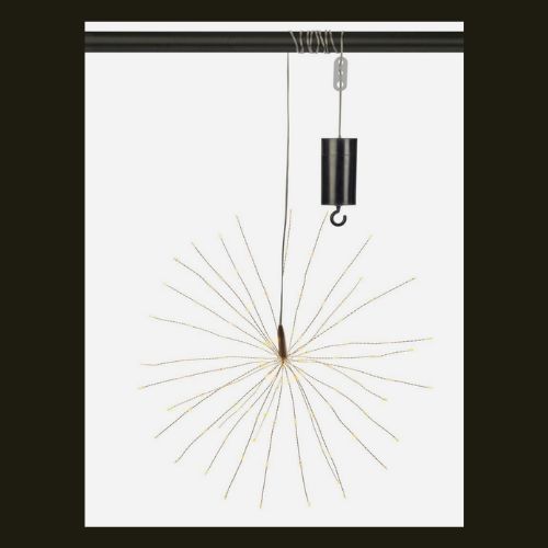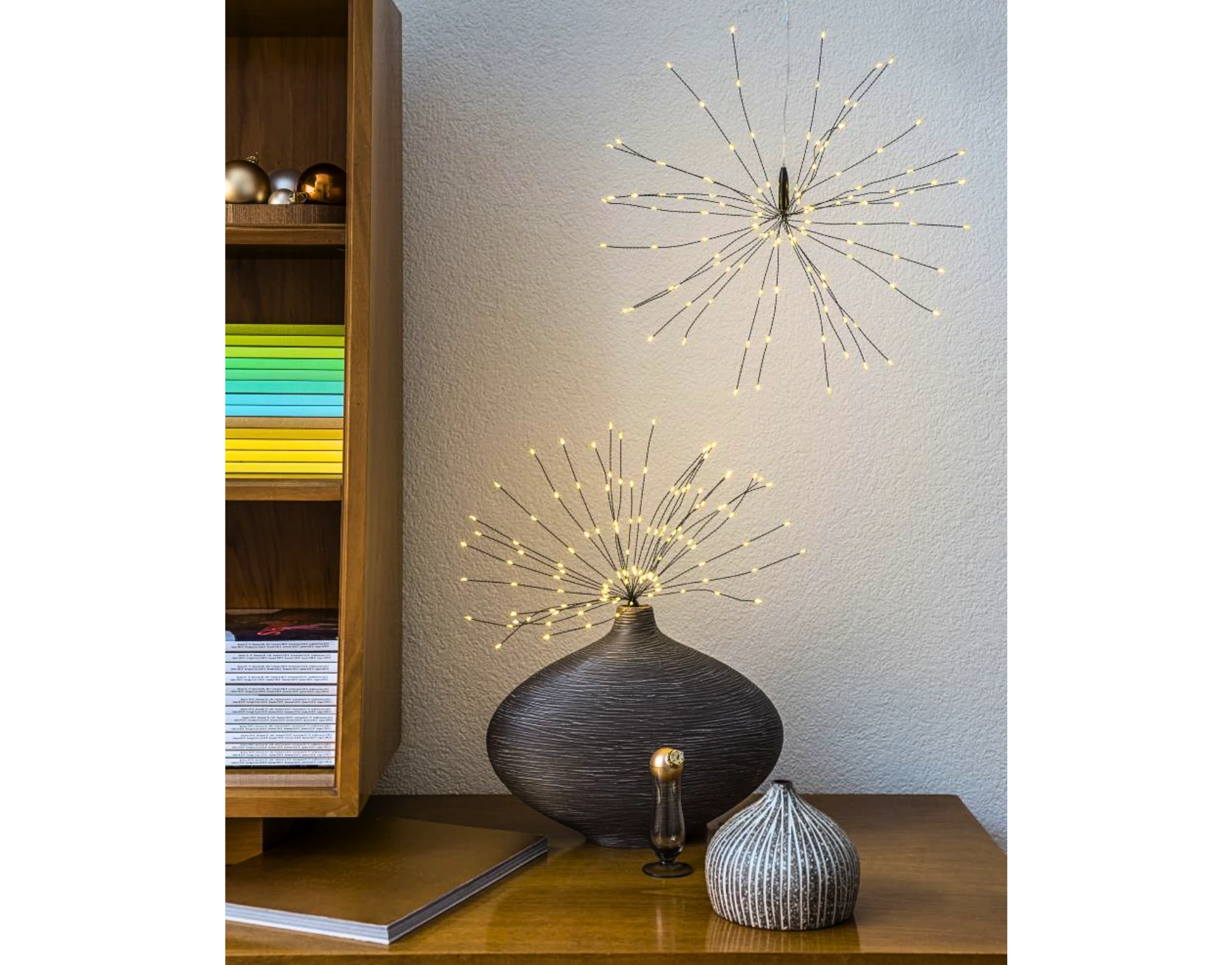 Das Eridani LED-Lichtdekoelement in Schwarz (Ø 30 cm) sorgt mit 120 warmweissen LEDs auf 30 filigranen Kupferdrähten für eine stimmungsvolle, kugelförmige Beleuchtung – ideal für Innen- und Aussenbereiche.