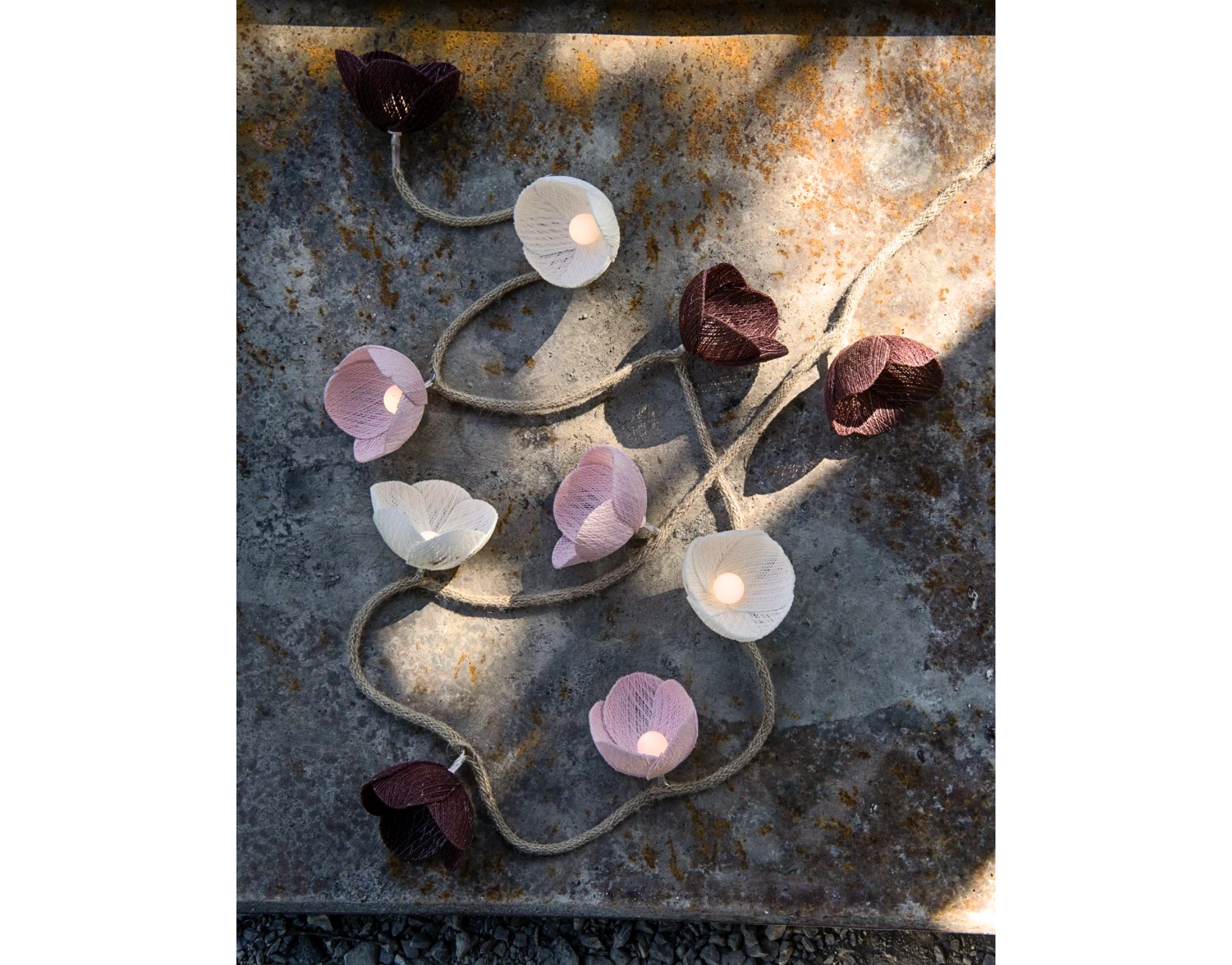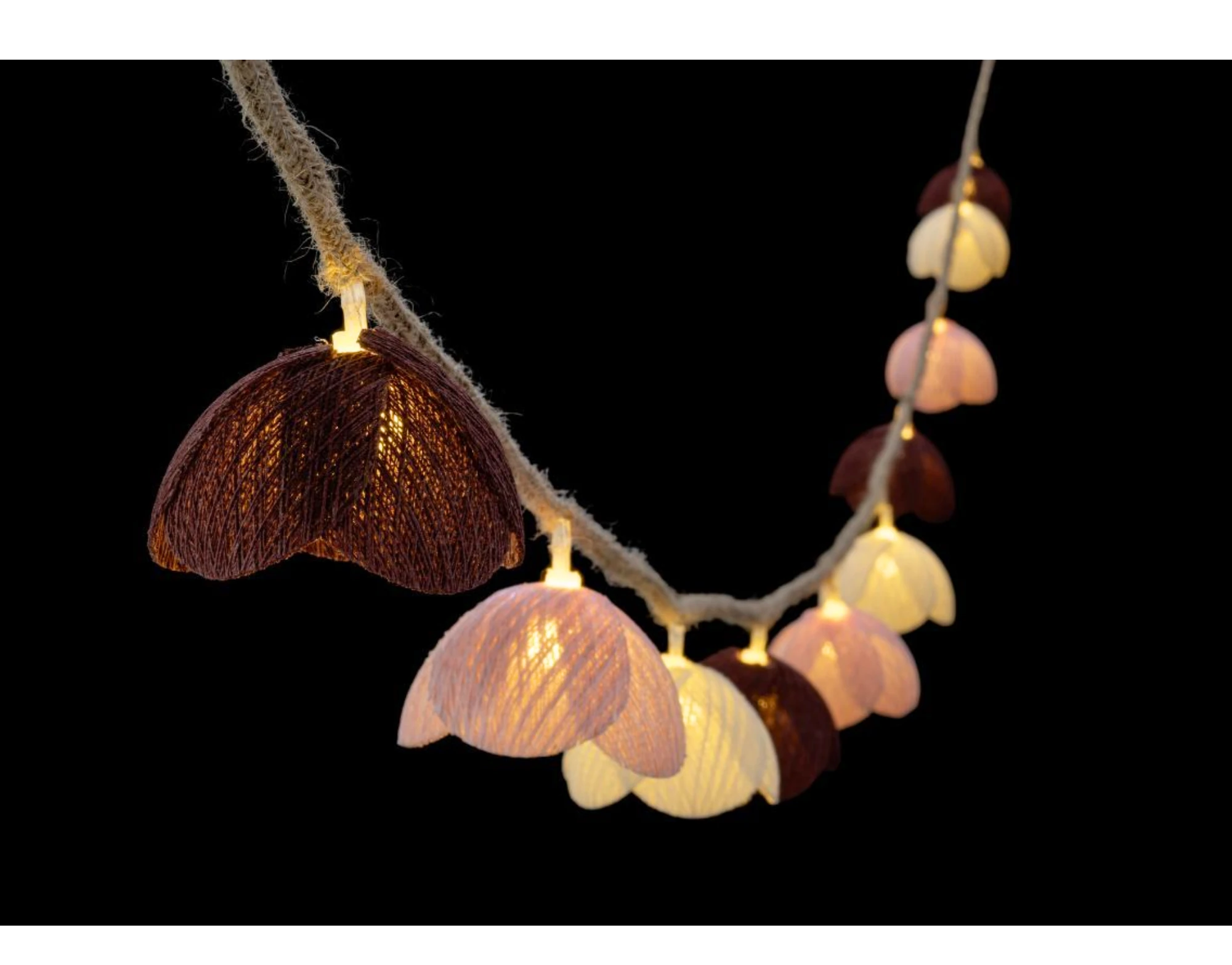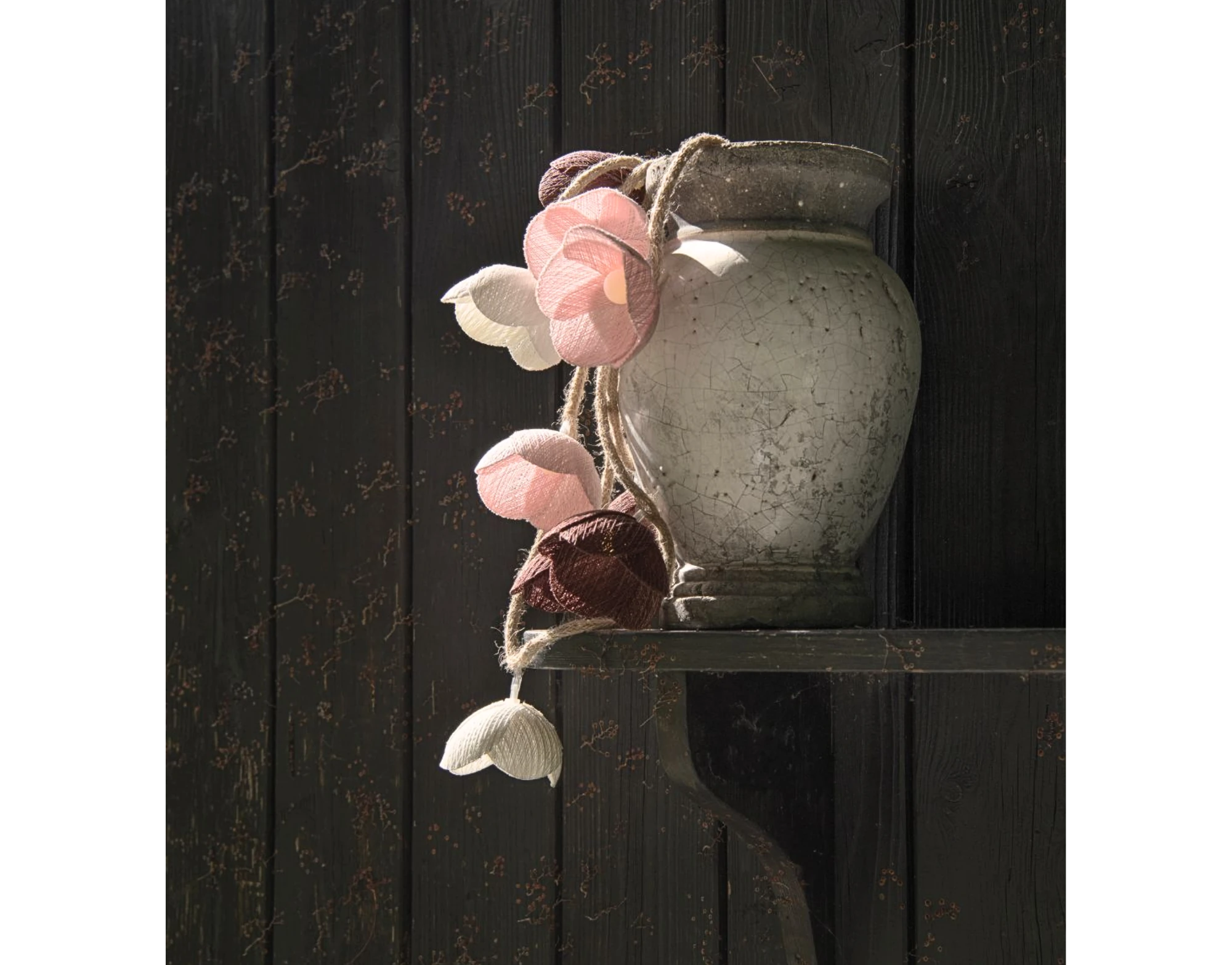 Die Flower Lichterkette bringt Farbe und Freude in jeden Raum. Die 10 warmweissen LEDs sind in liebevoll gestalteten Baumwollblüten eingebettet und schaffen eine gemütliche, stimmungsvolle Atmosphäre. Mit einer Länge von 2,7 Metern lässt sich die Kette flexibel platzieren, während das braune Kabel dezent im Hintergrund bleibt.