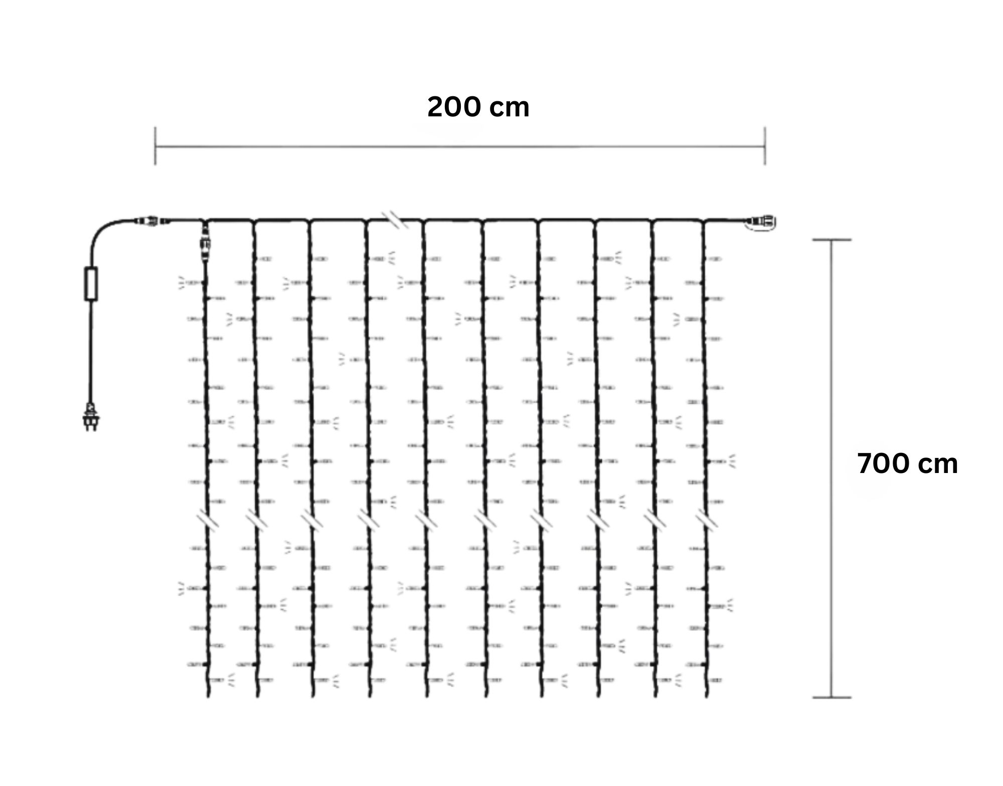 Es lassen sich bis zu 9 Vorhänge (18 Meter) miteinander koppeln. Mit 1080 Lichtpunkten, gleichmässig verteilt auf 18 Stränge, erzeugt der Vorhang ein besonders stimmungsvolles Lichtbild.