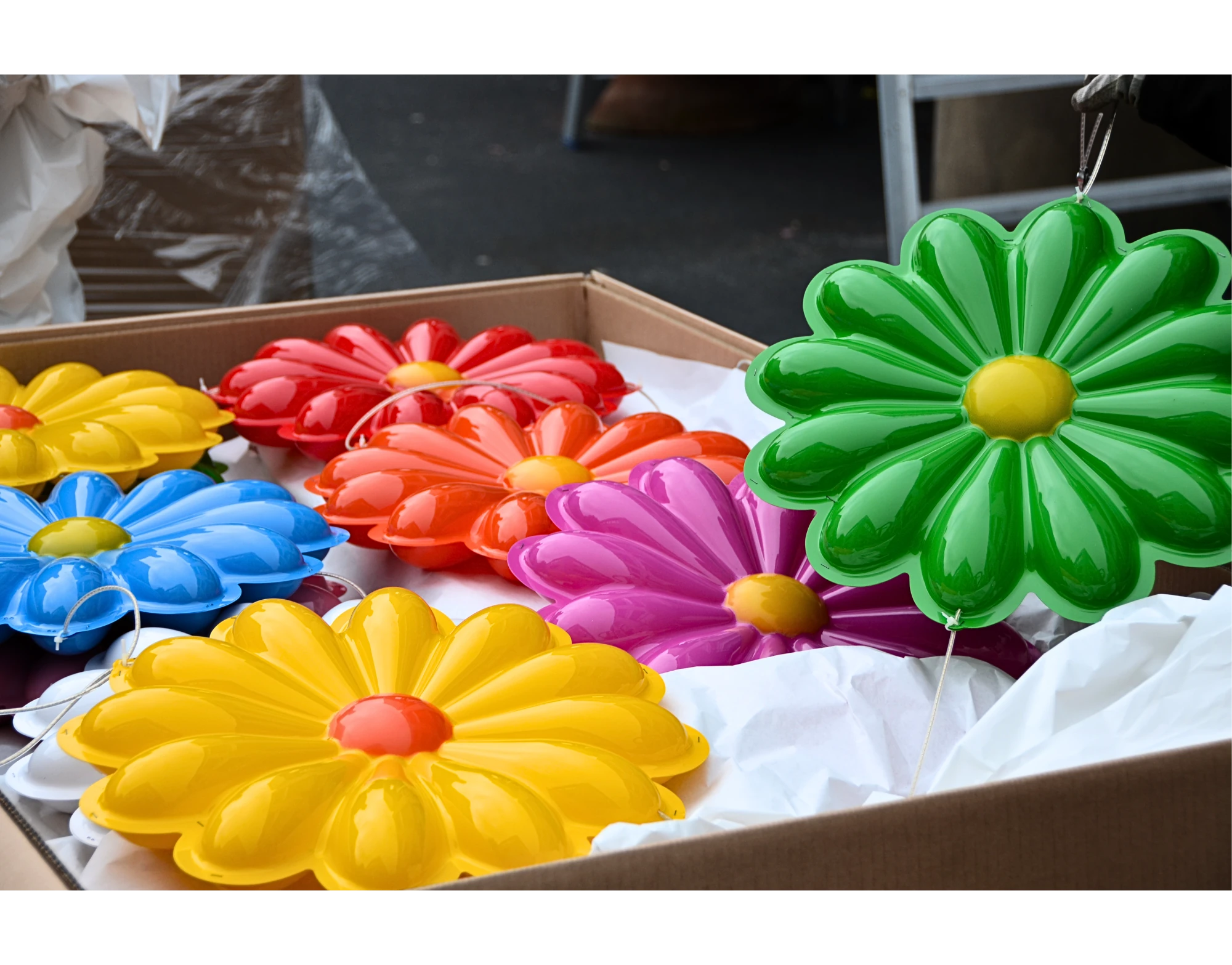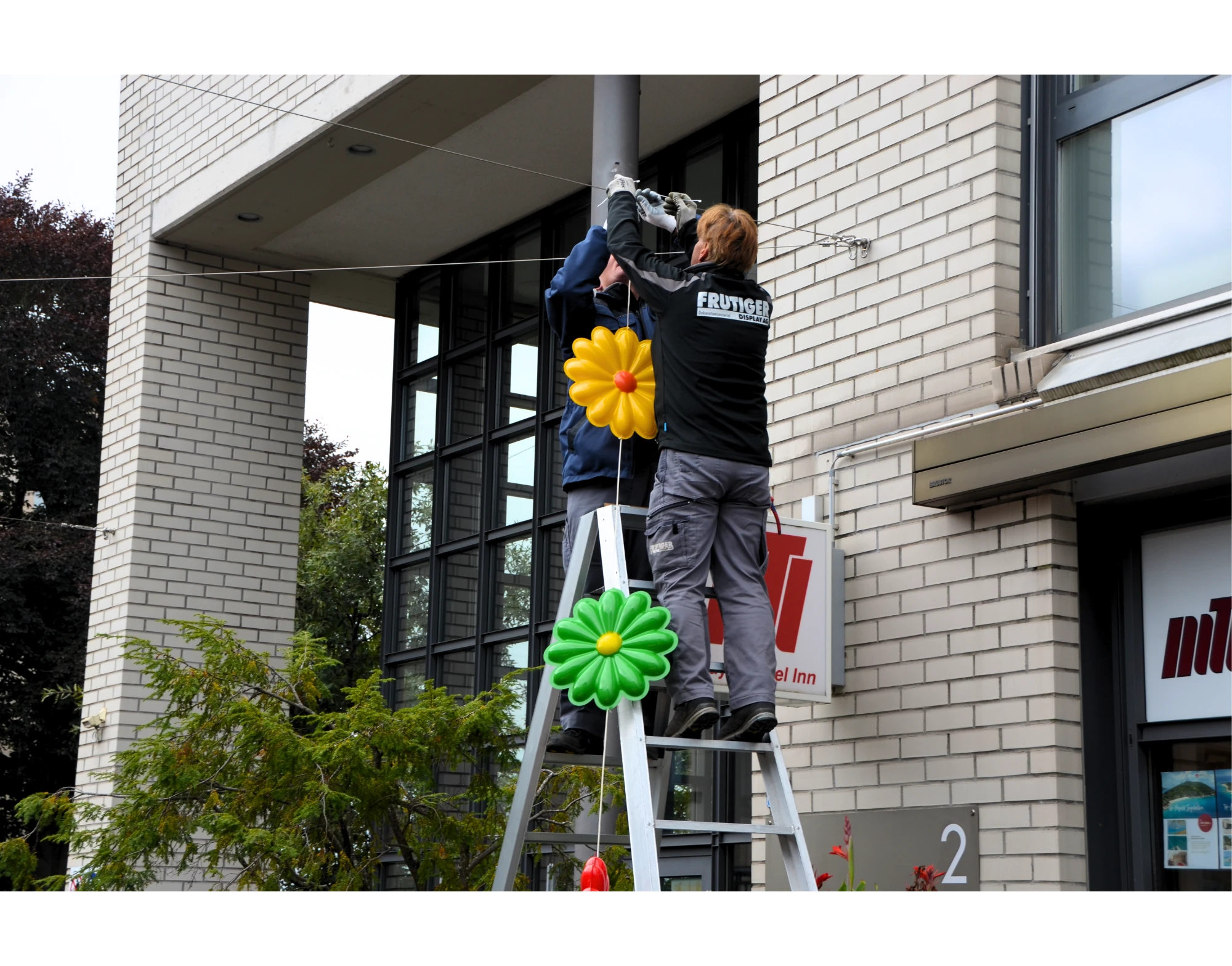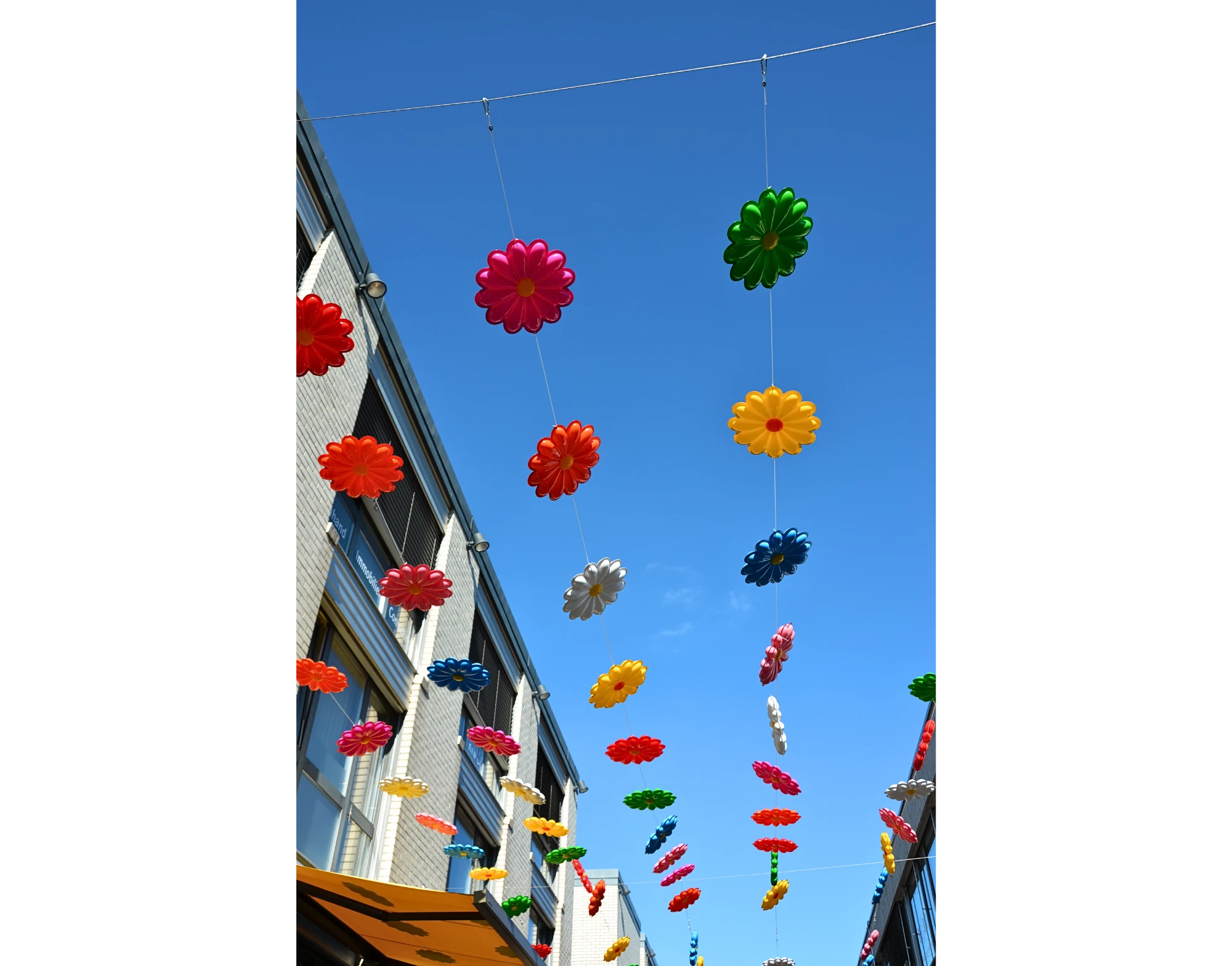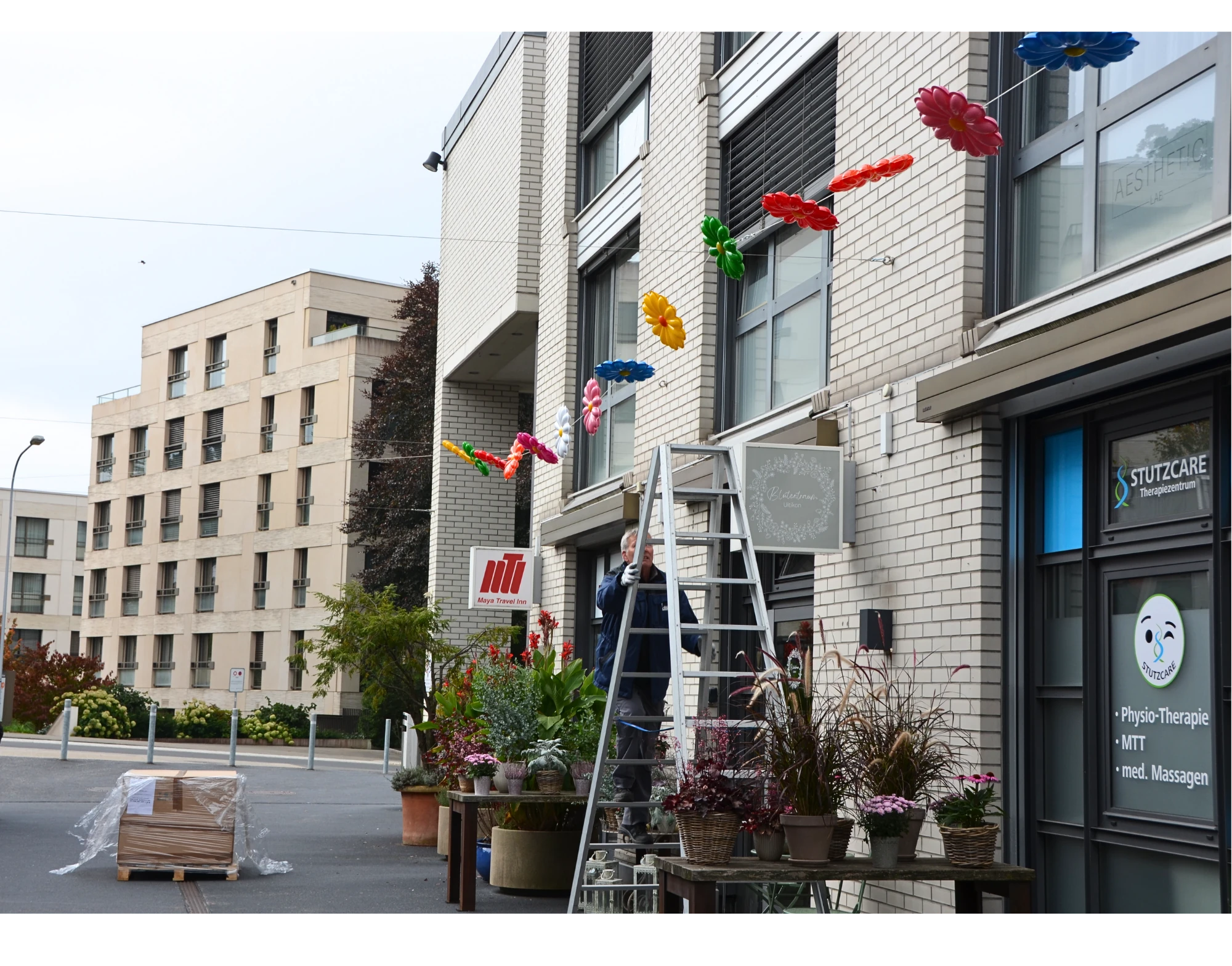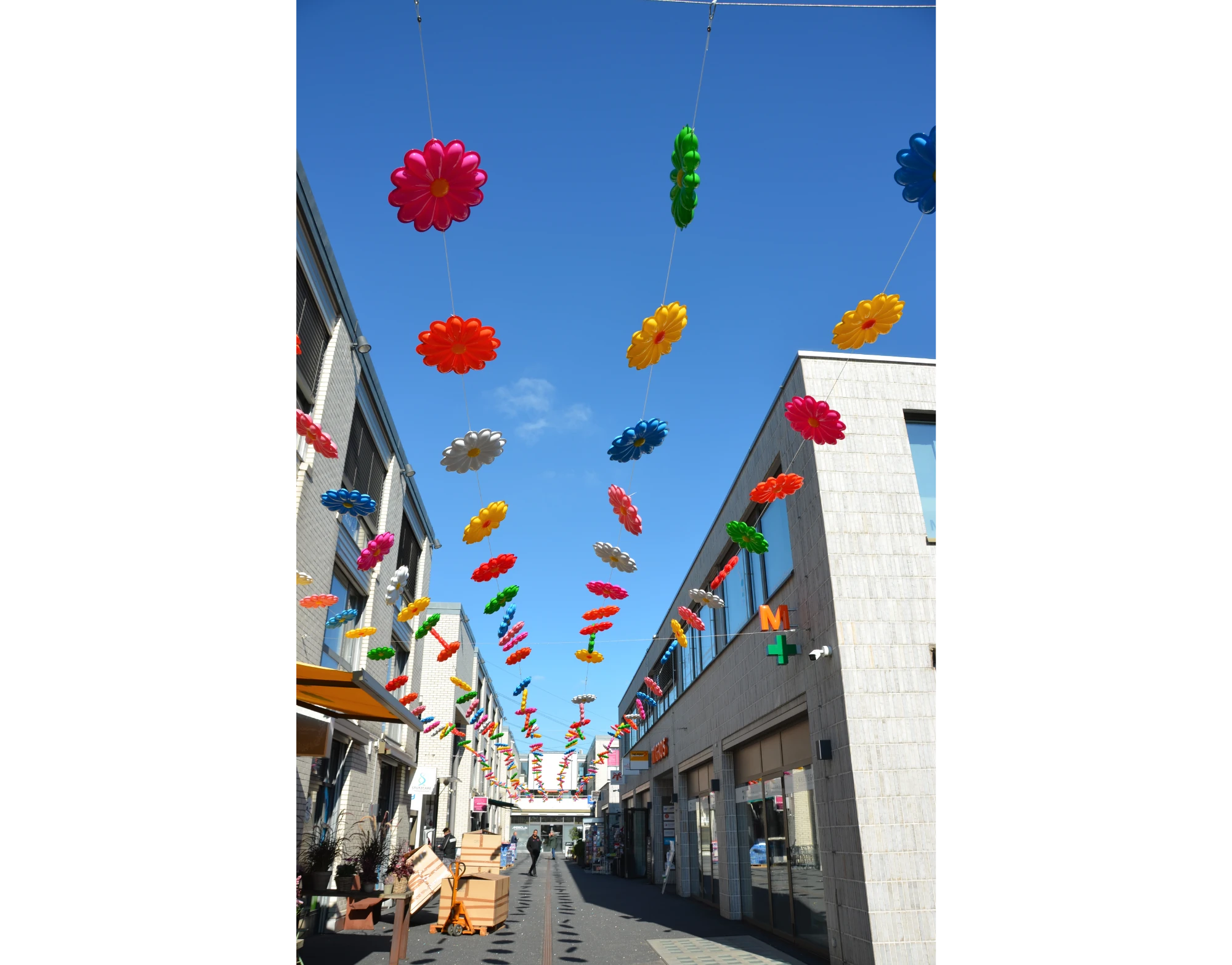 In den Farben Weiss, Gelb, Orange, Grün, Blau, Rosa und Pink schweben die 40 cm grossen Blumen scheinbar leicht über den Köpfen der Besucherinnen und Besucher. Die verspielte Anordnung bringt Bewegung in die Architektur, setzt frische Akzente und sorgt für eine positive, frühlingshafte Atmosphäre.