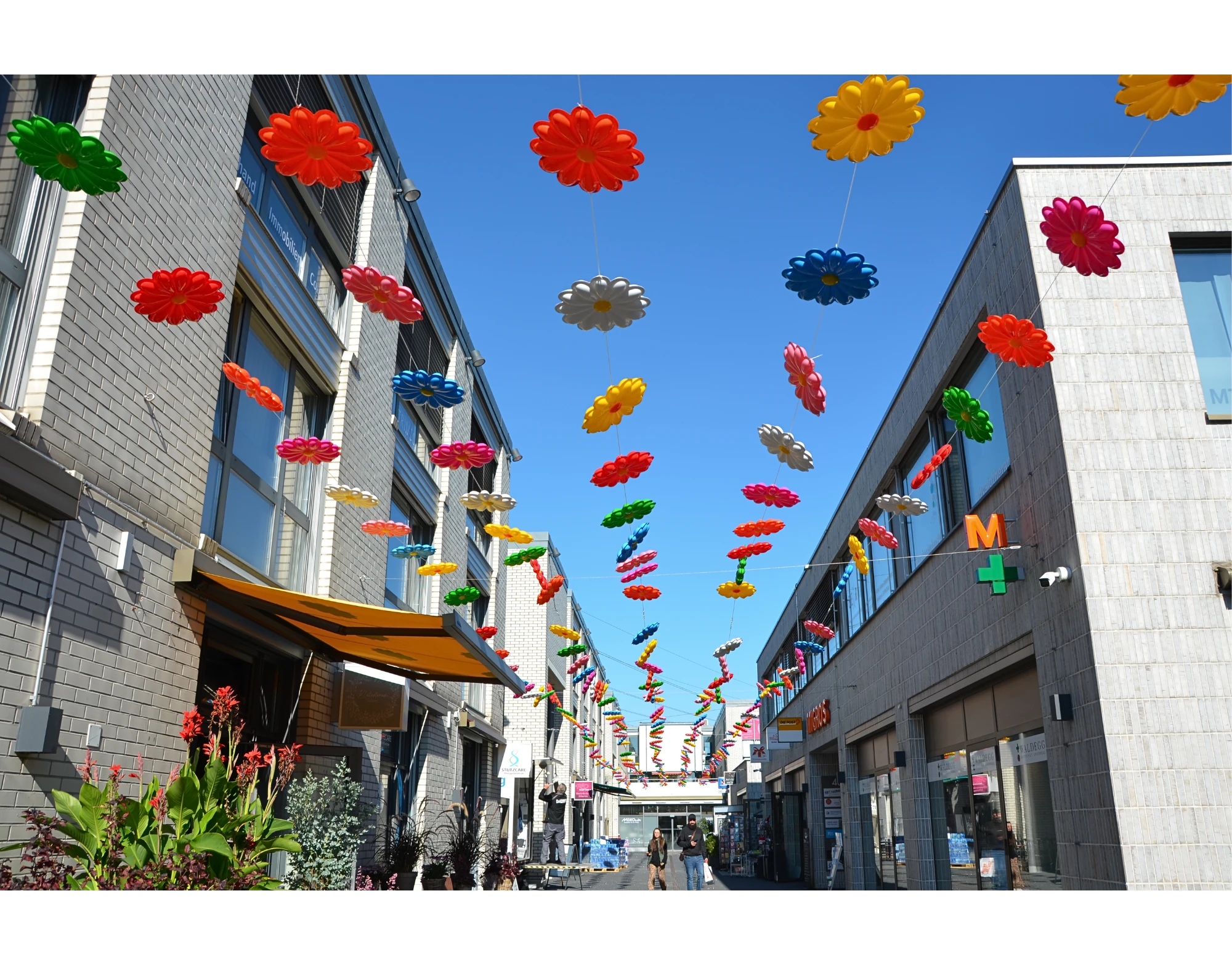 Mit dem Frühlingsprojekt im Zentrum Waldegg wurde die Ladenpassage in eine farbenfrohe Wohlfühlzone verwandelt. Leuchtende Blumenkopf-Girlanden aus Kunststoff überspannen den Raum und schaffen ein lebendiges, einladendes Ambiente.