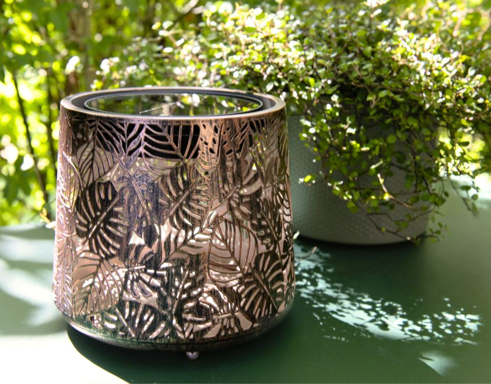 Die Solar Antic Mini Jungle bringt tropisches Flair in Ihren Garten, auf die Terrasse oder den Balkon – im handlichen Format. Das detailreich gearbeitete Metallgehäuse in edlem Bronze mit dekorativem Jungle-Muster erzeugt stimmungsvolle Licht- und Schattenspiele und sorgt für eine warme Atmosphäre.