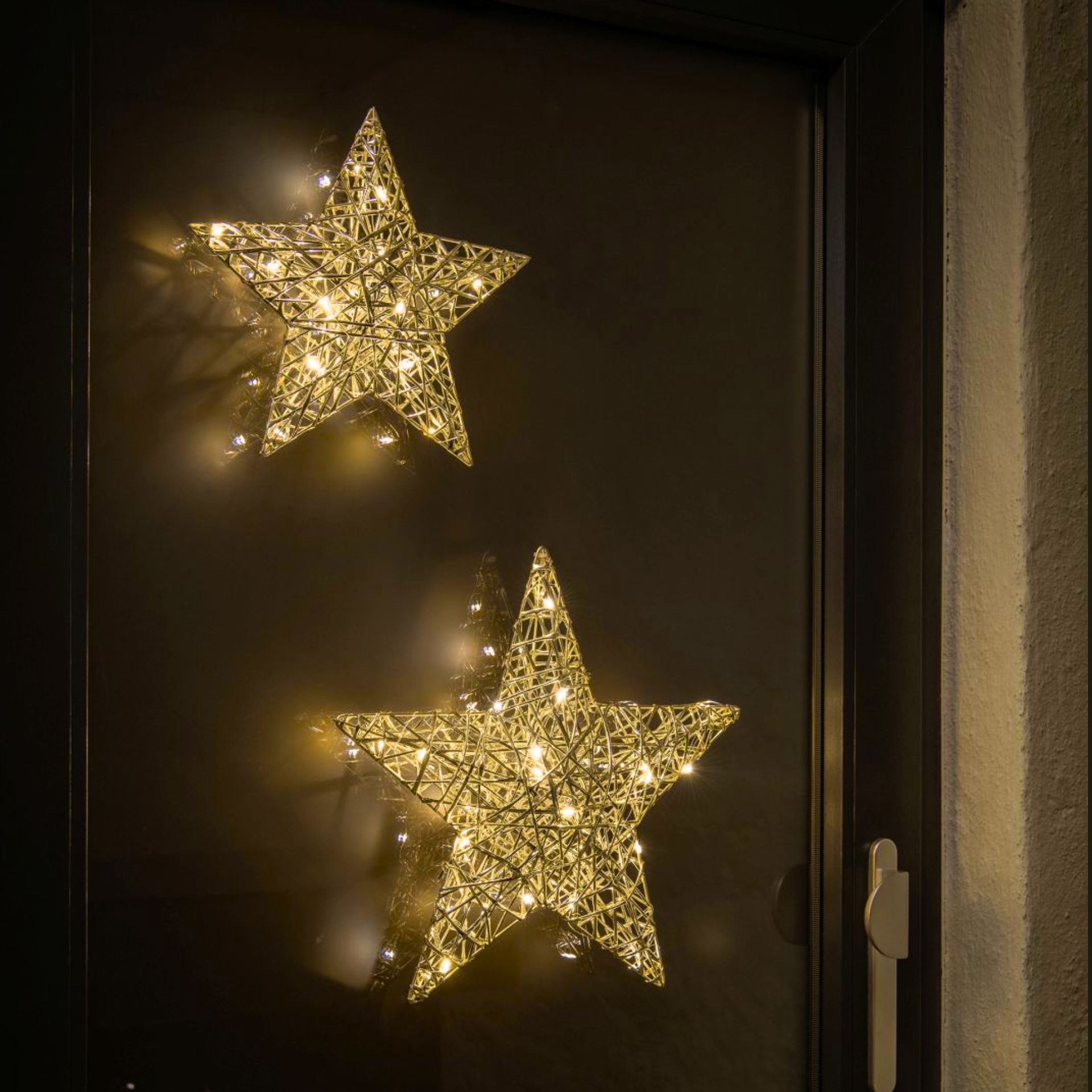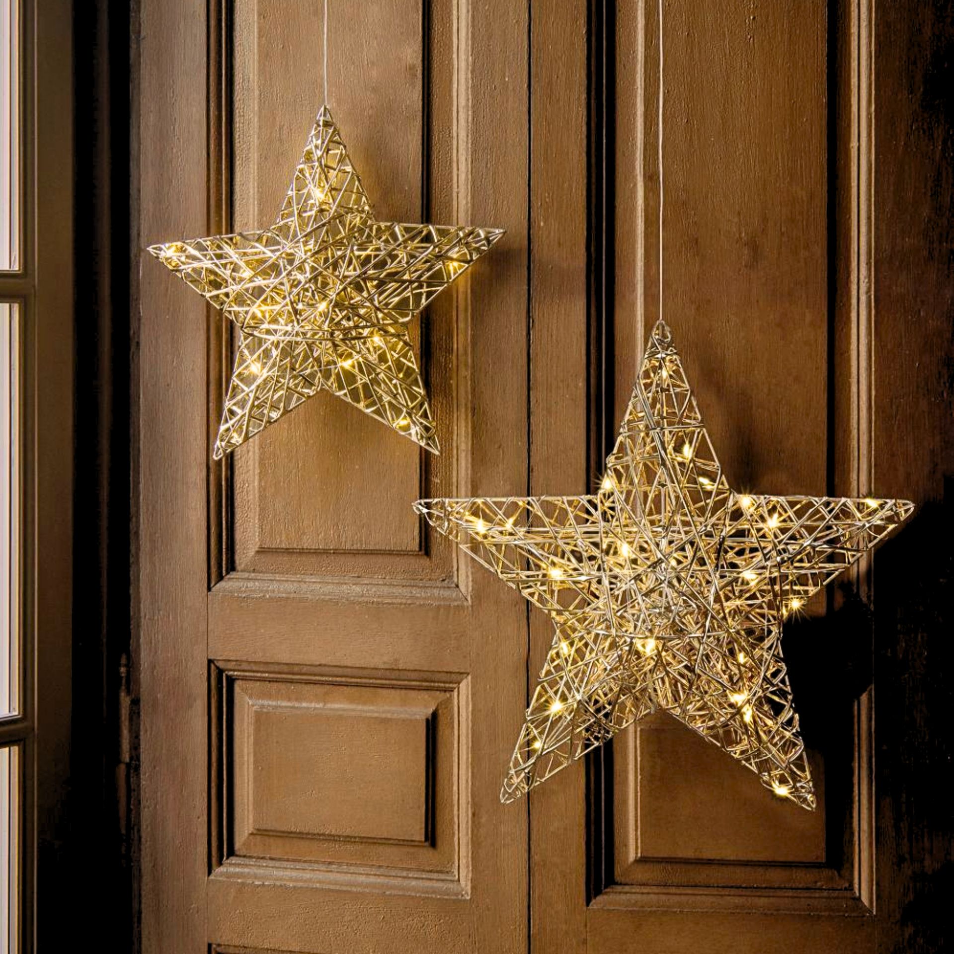 Der hängende goldene Stern, ist eine elegante Dekoration für Innen- und Aussenbereich. Mit 20 warmweissen LEDs sorgt er für stimmungsvolle Beleuchtung und schafft eine festliche Atmosphäre. Der Betrieb erfolgt über 3xAA-Batterien (nicht im Lieferumfang enthalten) und eine praktische Timer-Funktion, die den Stern nach 6 Stunden automatisch abschaltet und nach 18 Stunden wieder einschaltet.