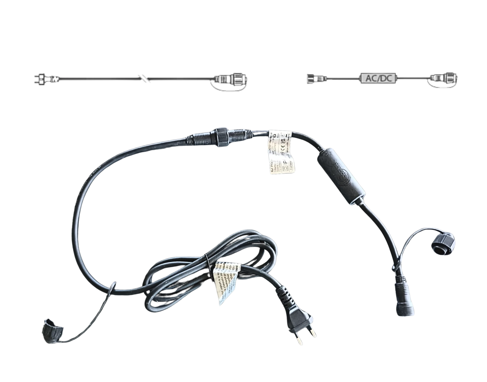 Dieses Set besteht aus einem 230V-Stromkabel (1,5 m) mit Netzstecker und Octoplus-Anschluss sowie einem LED+ Modul mit eingebautem Brückengleichrichter. Das Modul wandelt Wechselstrom (AC) in Gleichstrom (DC) um – das ist notwendig, damit LED+ Leuchten richtig funktionieren. Beide Teile sind mit Octoplus-Steckverbindern ausgestattet und lassen sich einfach zusammenstecken.