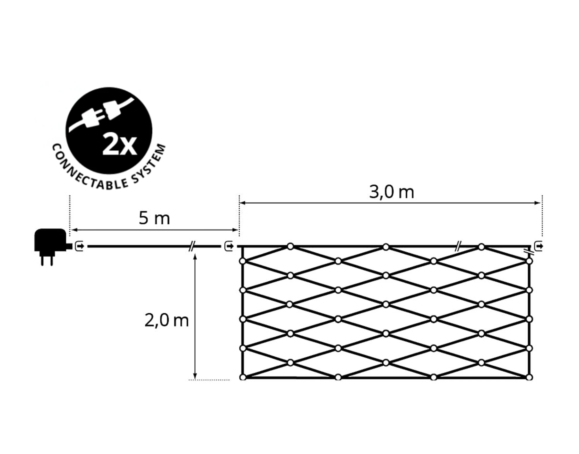 Mit einer Grösse von 200 × 300 cm eignet sich das Netz perfekt für Hecken, Geländer, Wände oder als Lichtdeko für Events und Feste. Dank 5 m Anschlusskabel und Netzbetrieb (31 V / 15 W) ist es schnell einsatzbereit und lässt sich mühelos installieren. Die dezente schwarze Kabelfarbe fügt sich unauffällig in jede Umgebung ein.