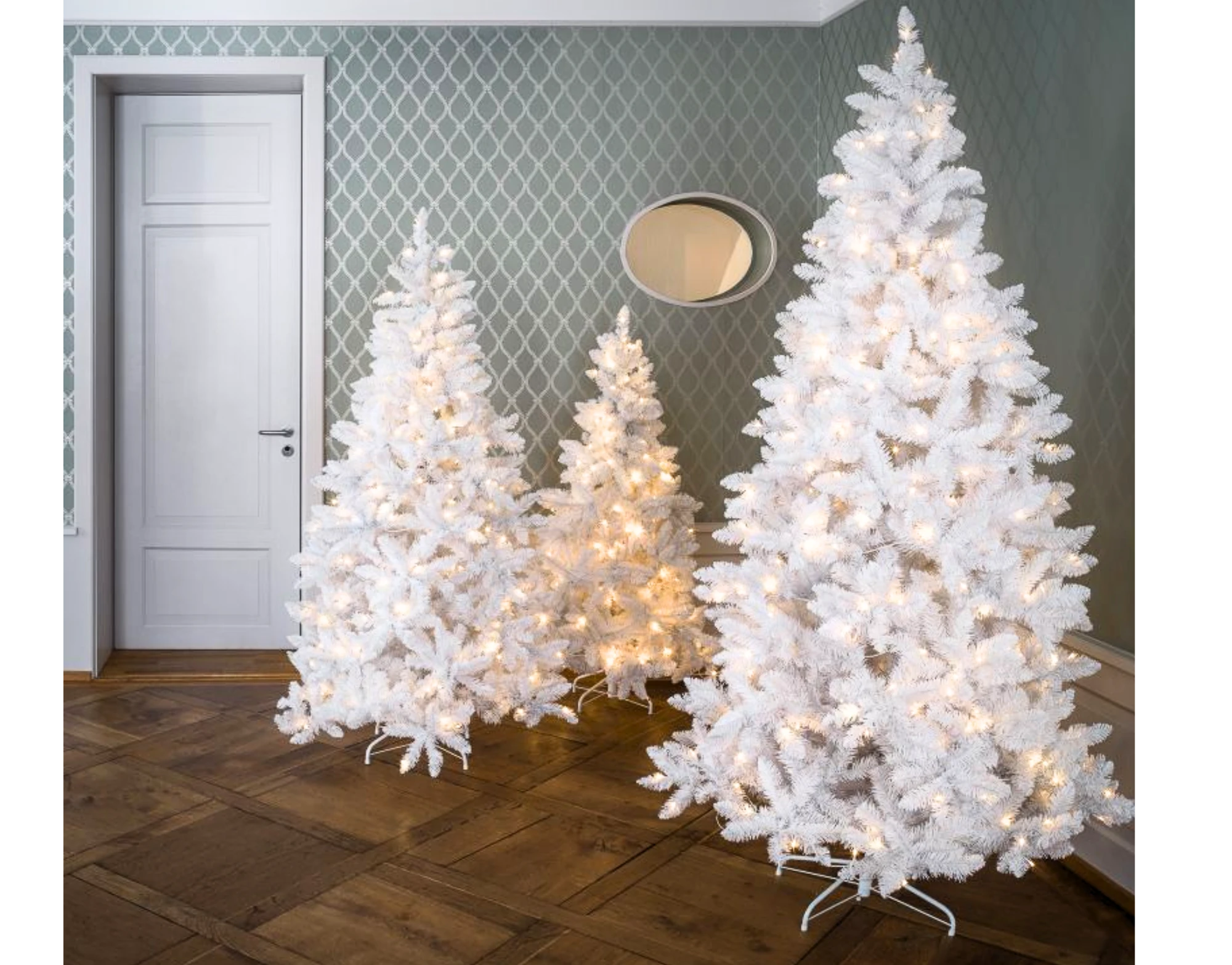 Elégant sapin de Noël artificiel en blanc moderne d'une hauteur de 150 cm. Équipé de 130 LED fixes intégrées dans une lumière blanc chaud pour une ambiance chaleureuse et conviviale.