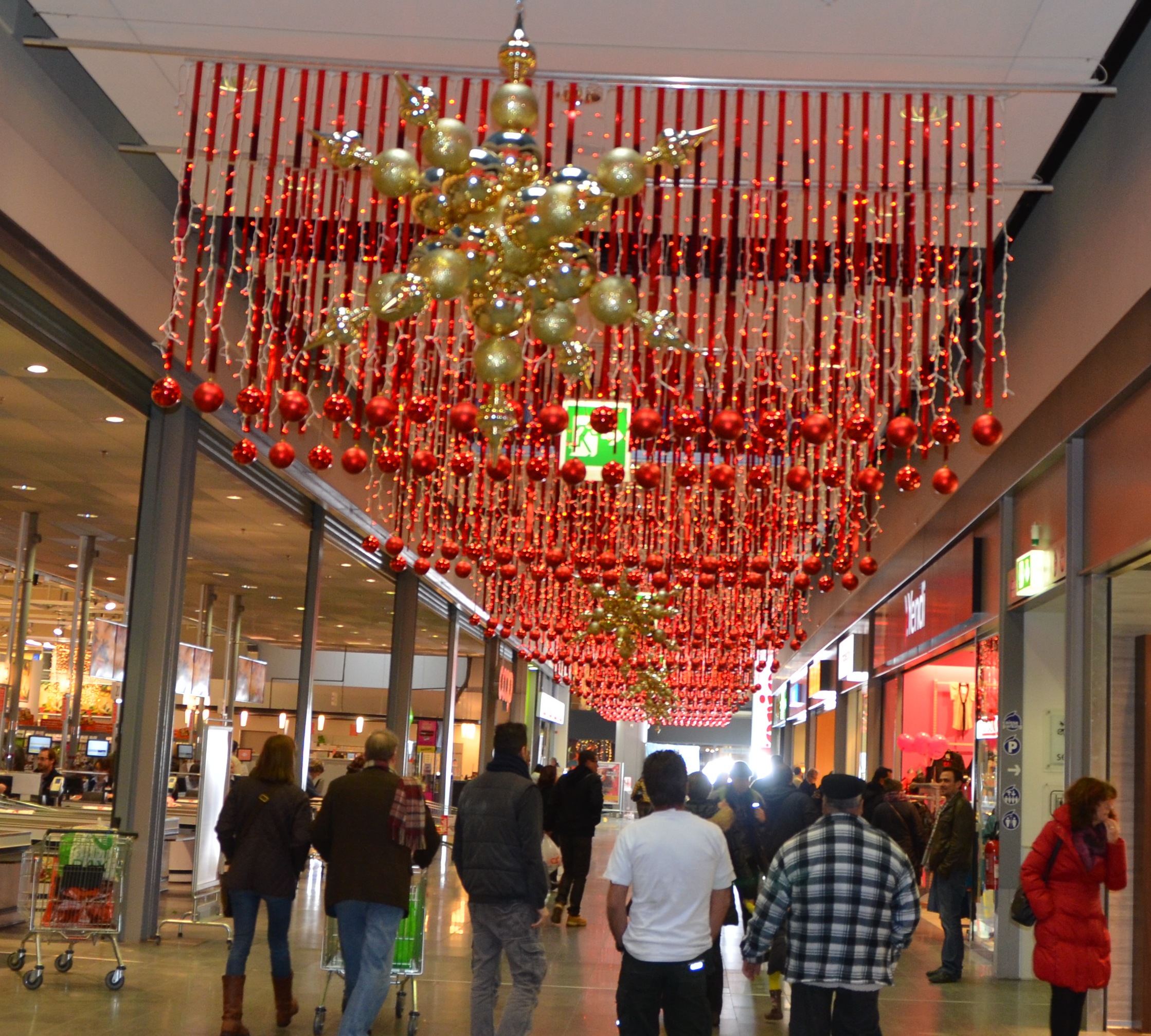 Kugel-Sterne, glänzende und beglimmerte Kugeln aus Kunststoff an der Decke montiert.
