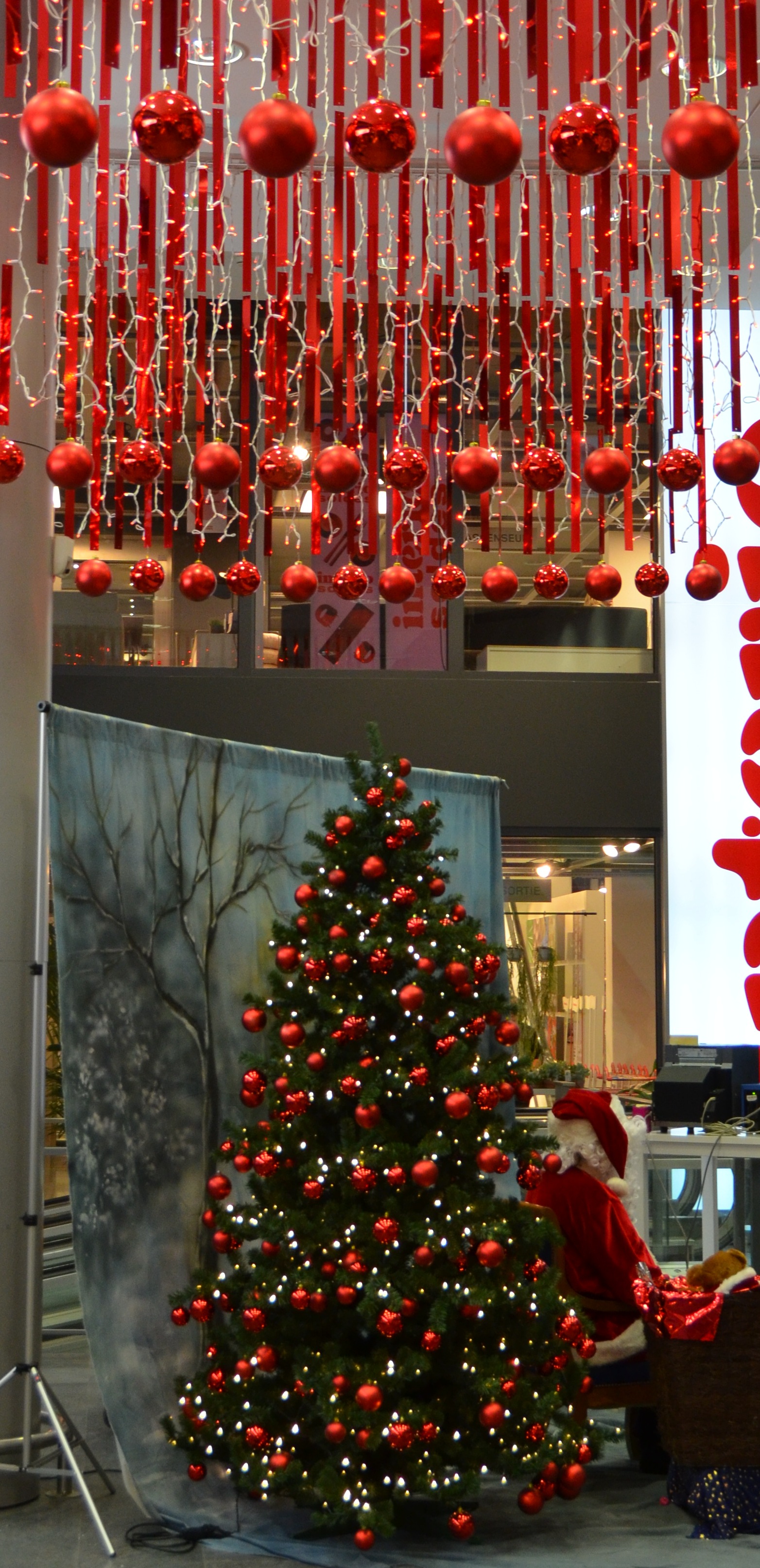 Lichtervorhänge LED warmweiss dekoriert mit roten Folienstreifen und