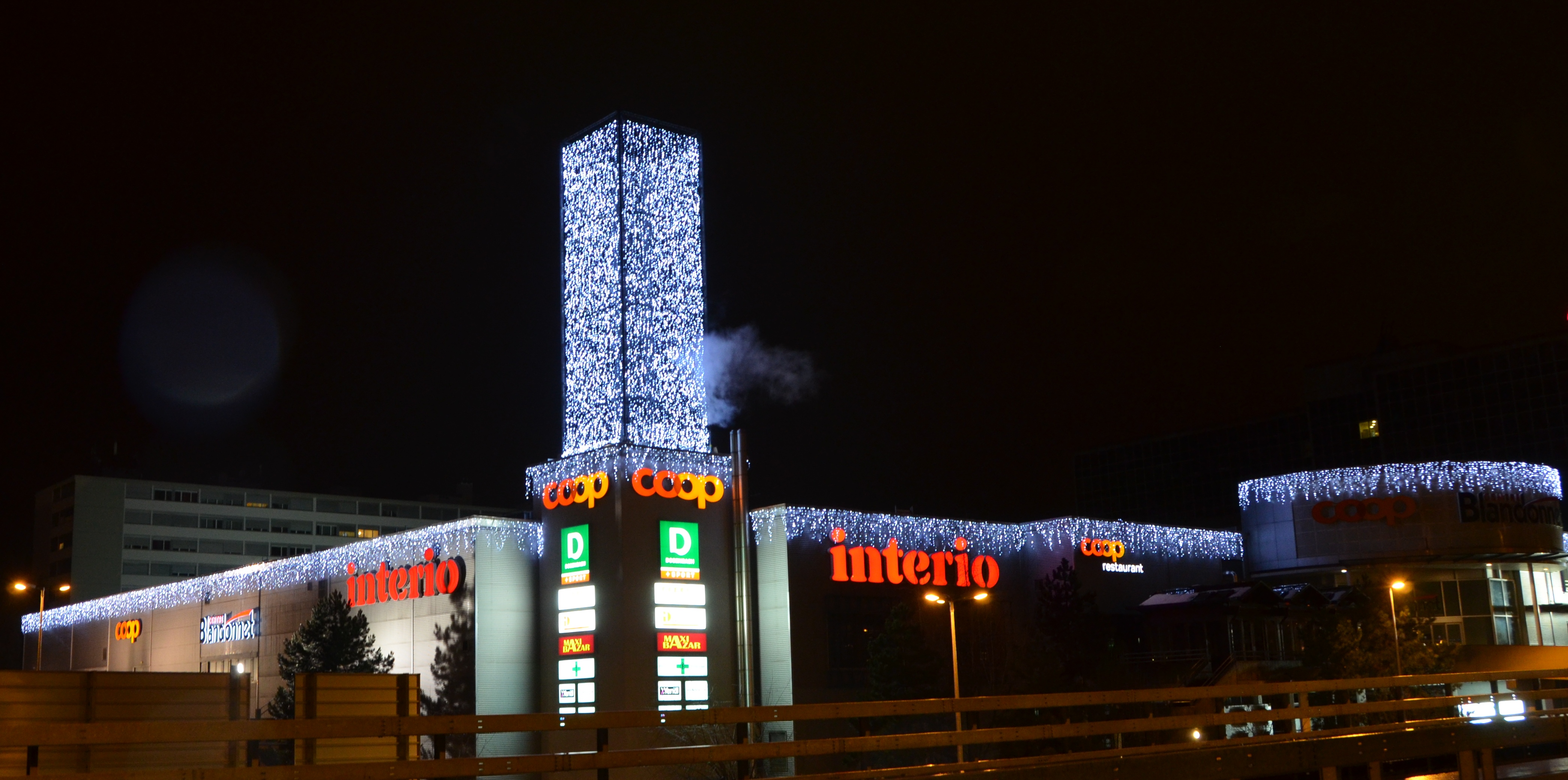 Der Werbeturm wurde mit LED Lichterketten reinweiss eingekleidet.