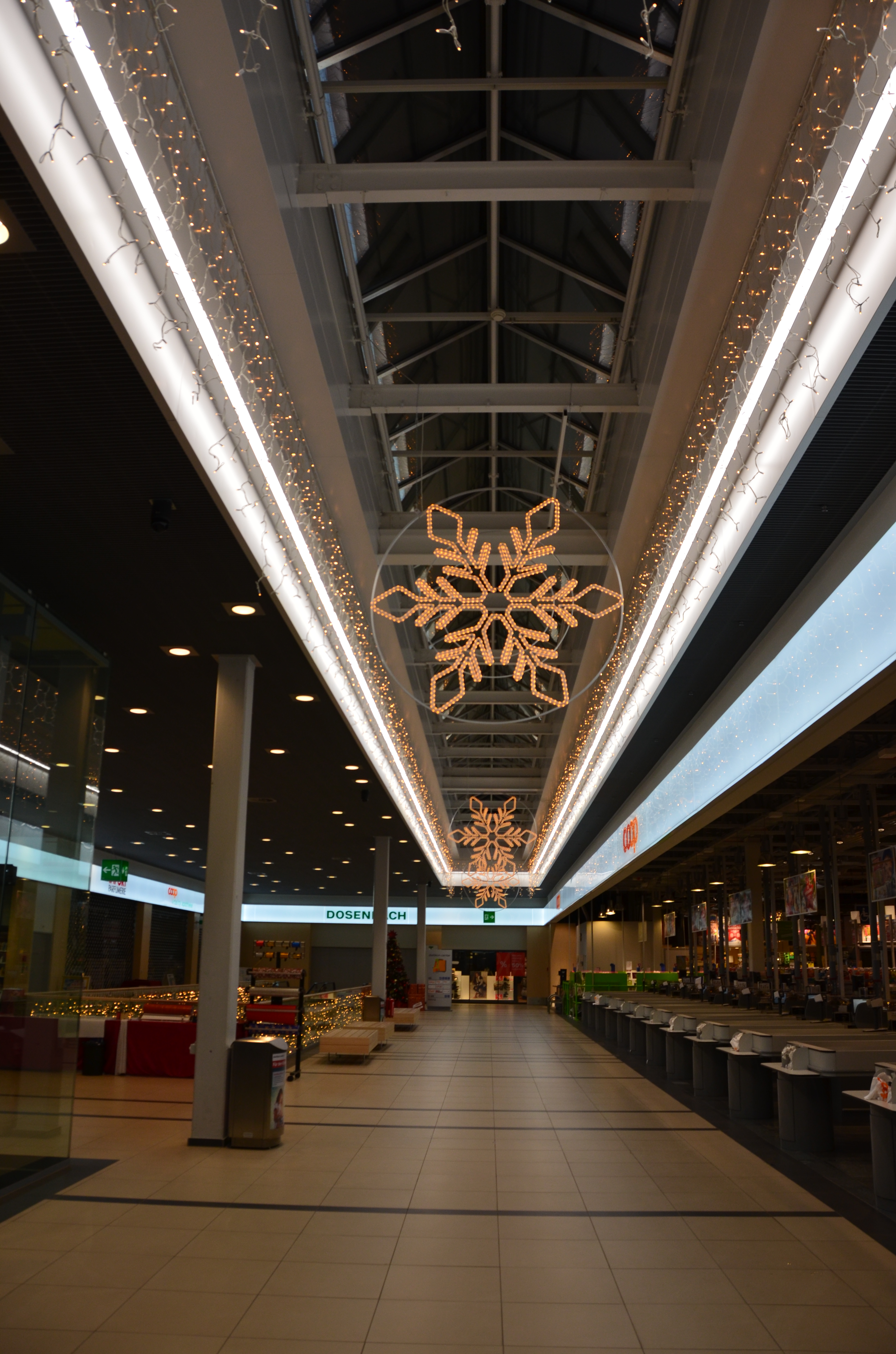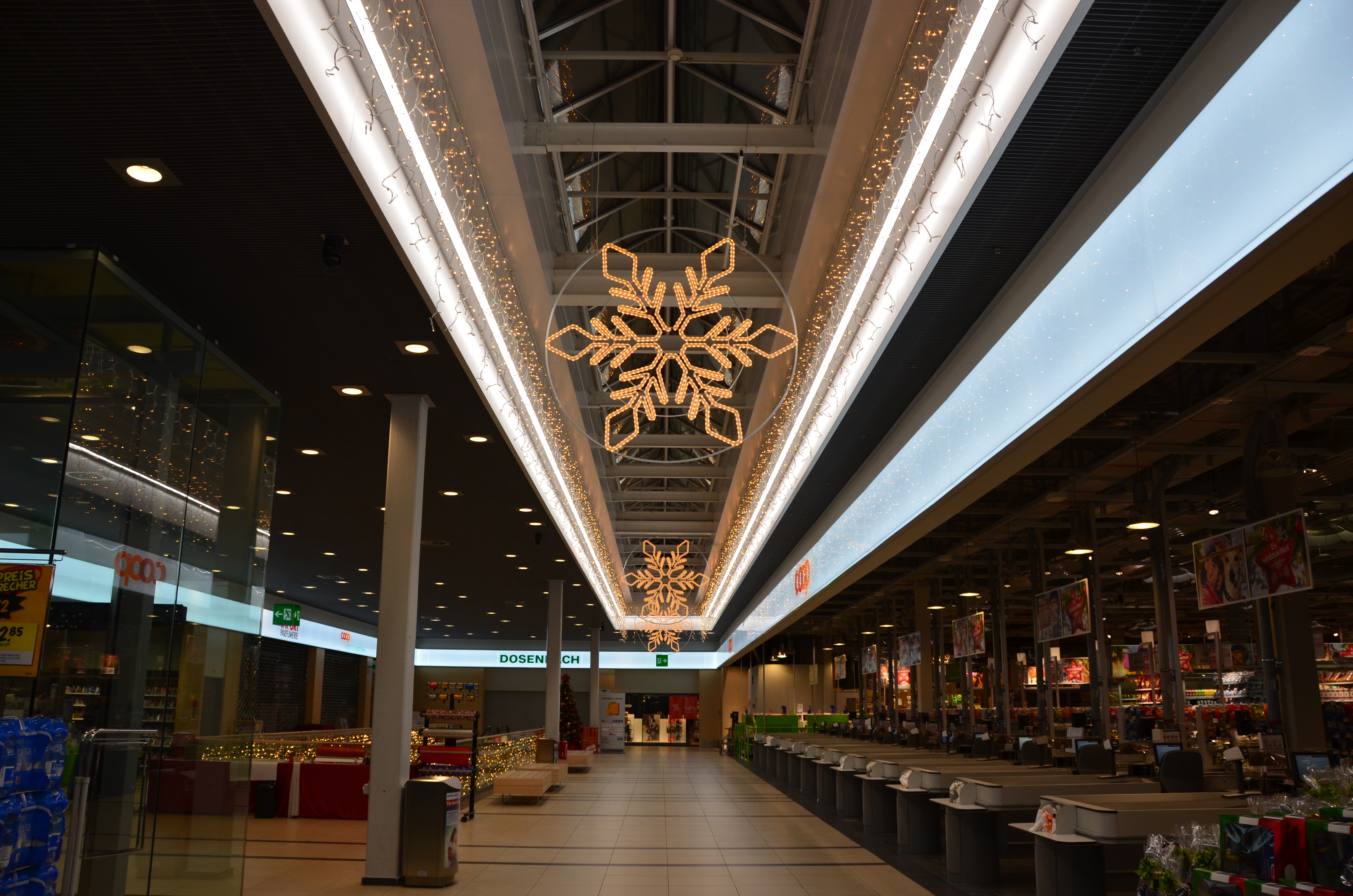 -Das Glasgeländer der Rolltreppe innen ist mit LED Lichtervorhängen eingekleidet.