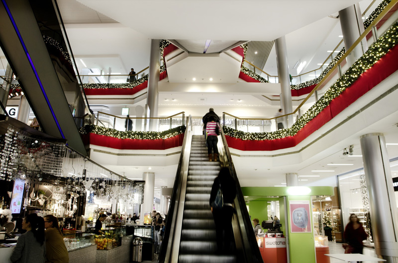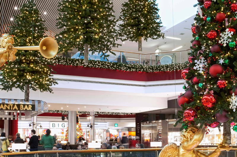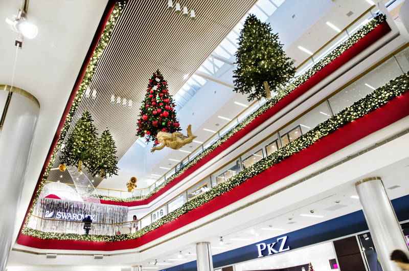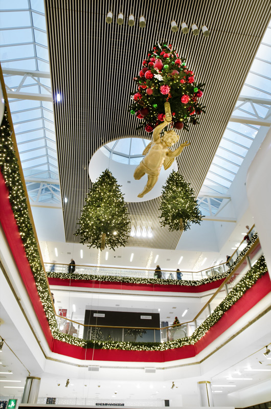 - künstliche Luvi-Tannenbäume mit LED Lichterketten geschmückt von der Decke hängend