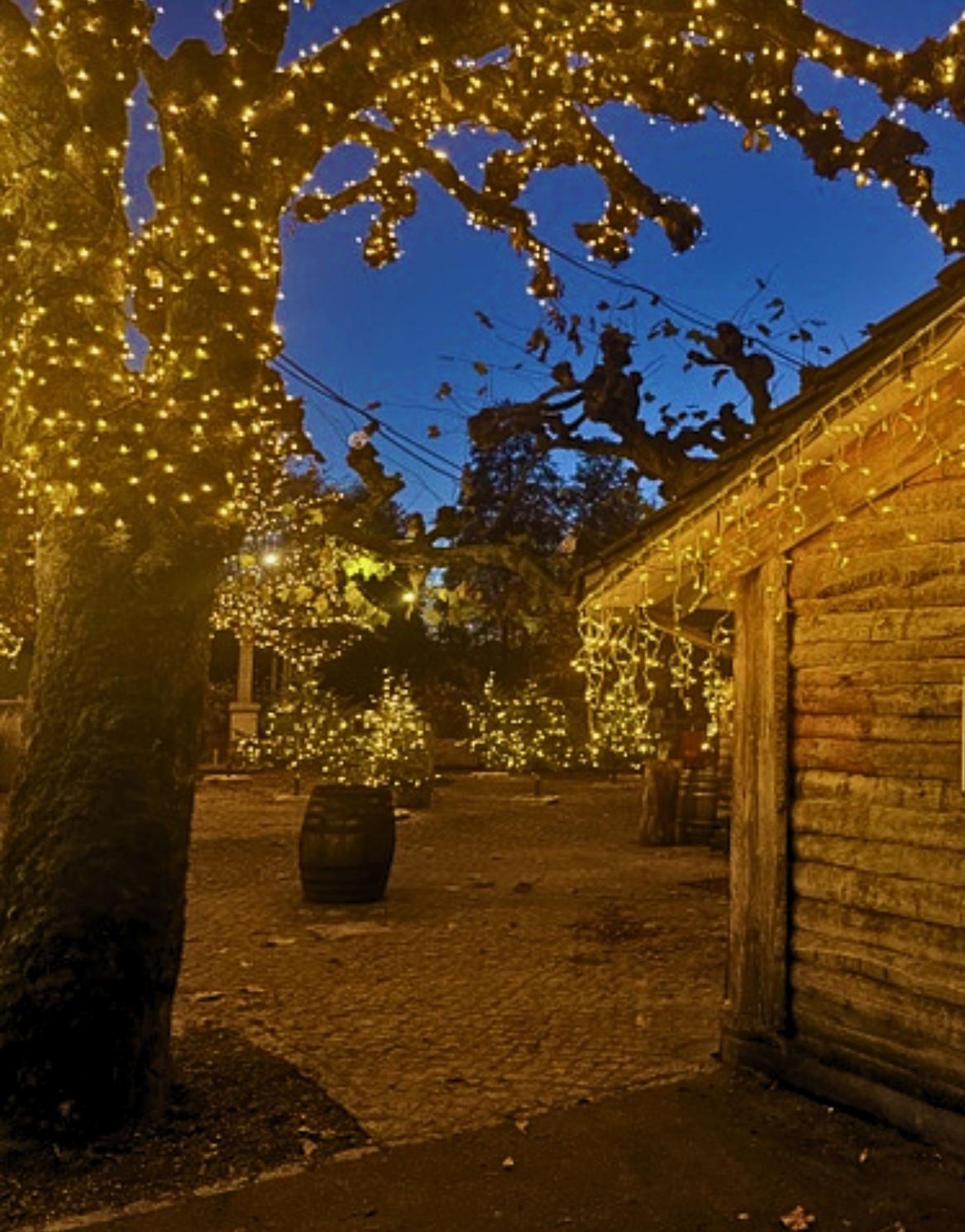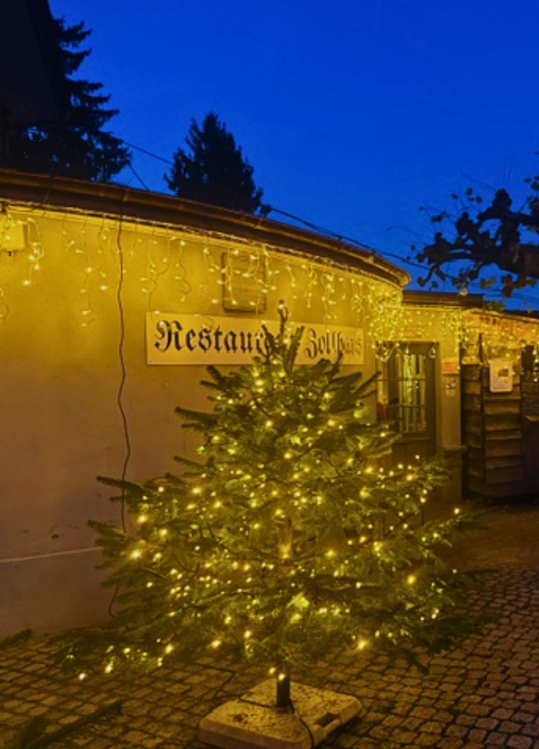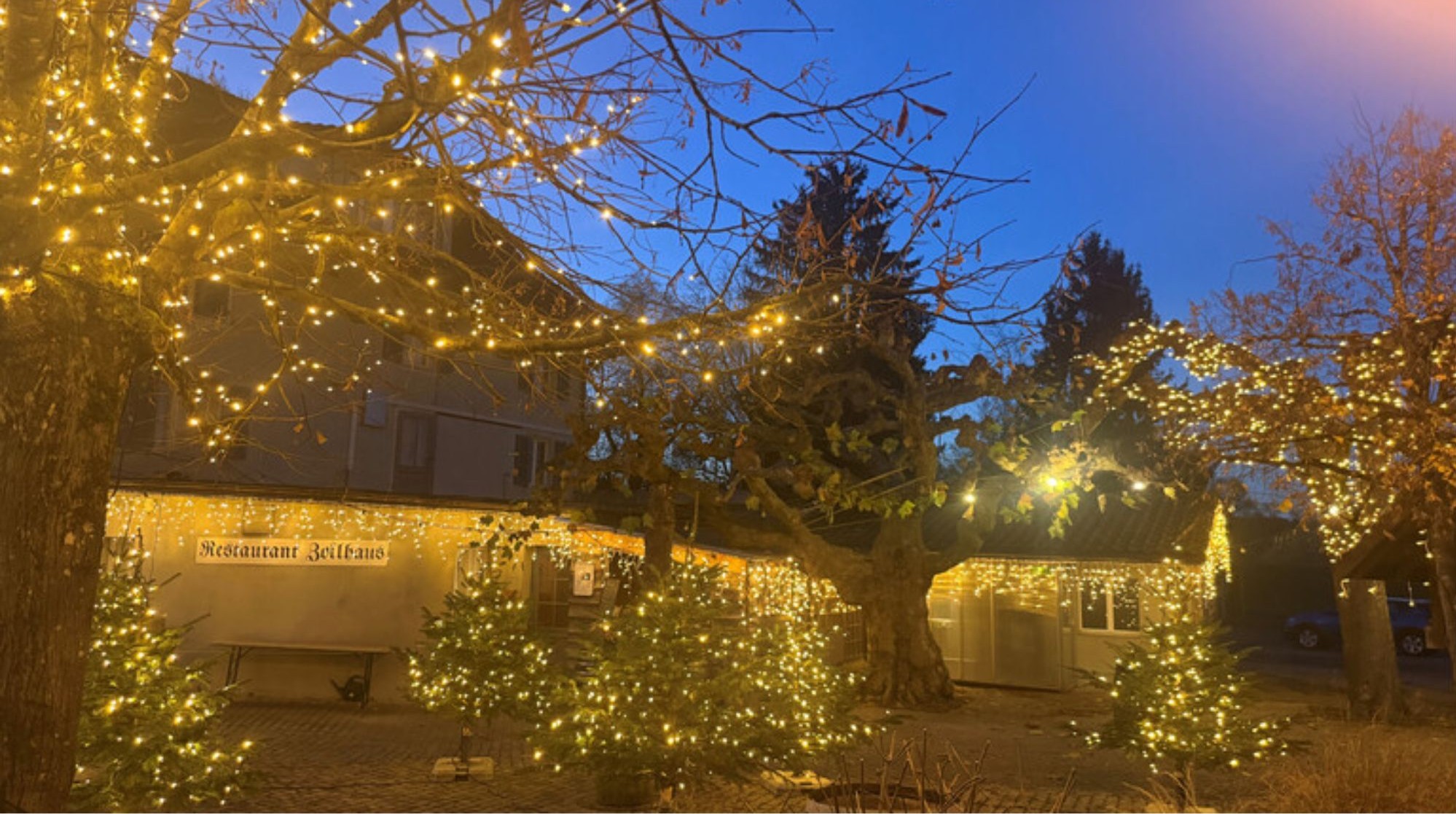Für das Restaurant Zollhuus wurde eine stimmungsvolle Weihnachtsbeleuchtung realisiert, die Besucher bereits beim Betreten der Anlage verzaubert. Ein Kastanien- und ein Lindenbaum erstrahlen vollständig in warmweissen Lichtern, die ihre organischen Formen elegant betonen. Zusätzlich sorgen die beleuchteten kleinen Tannen für eine festliche, einladende Atmosphäre.